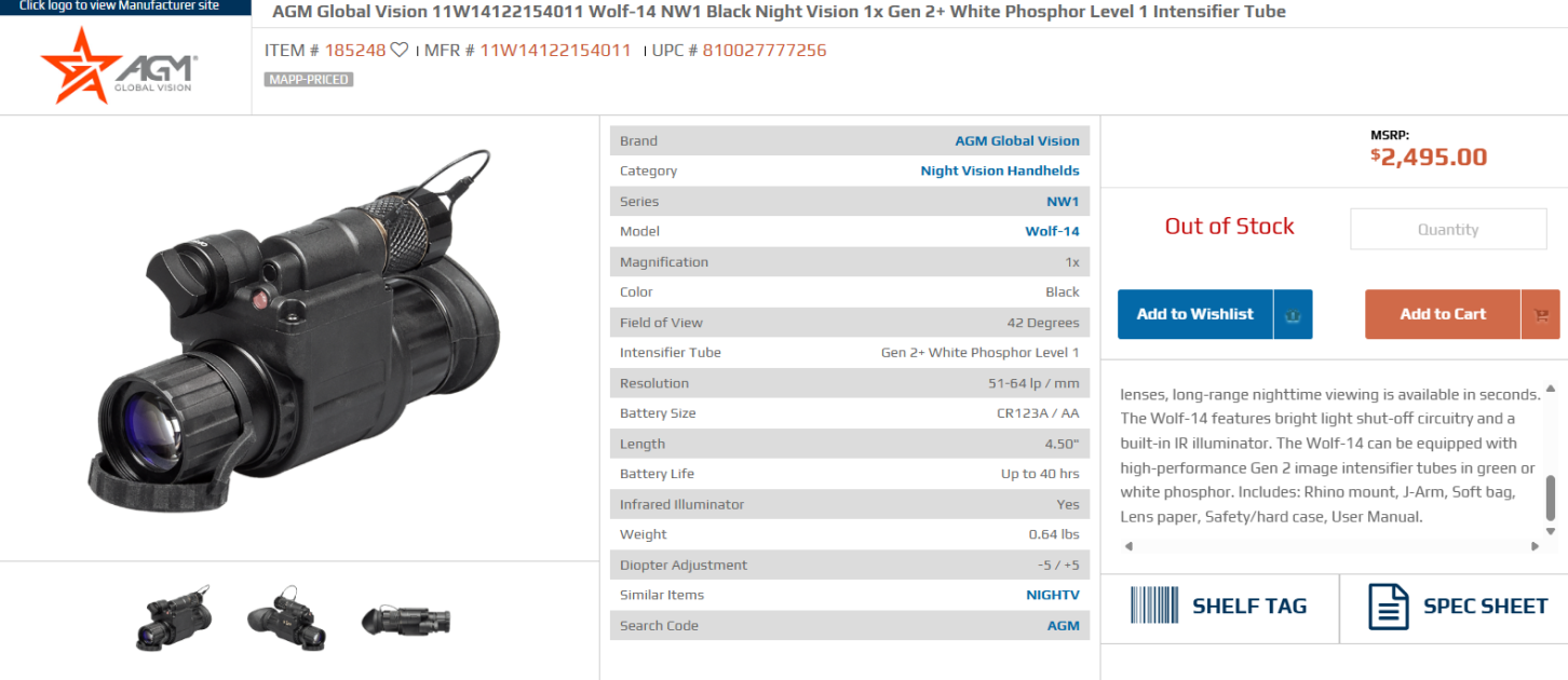 AGM Wolf-14 NW1 Black Night Vision 1x Gen 2+ White Phosphor