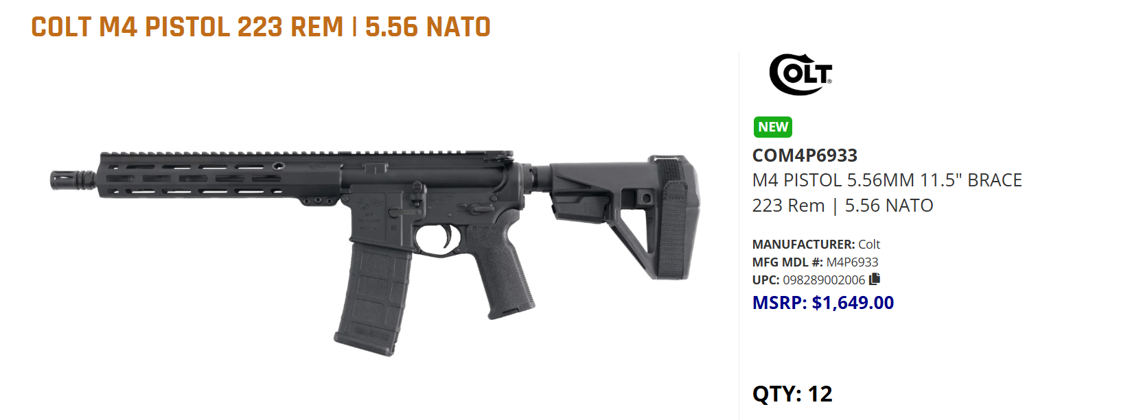 COLT M4 PISTOL 5.56MM 11.5″ BRACE 223 Rem | 5.56 NATO 2006