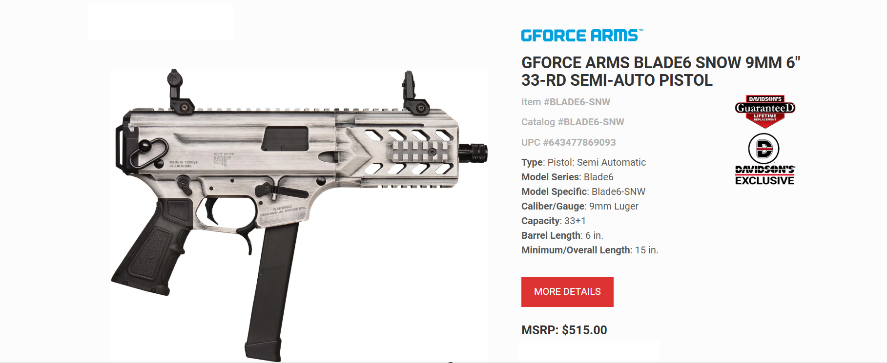 GFORCE ARMS BLADE6 SNOW 9MM 6″ 33-RD SEMI-AUTO PISTOL 9093