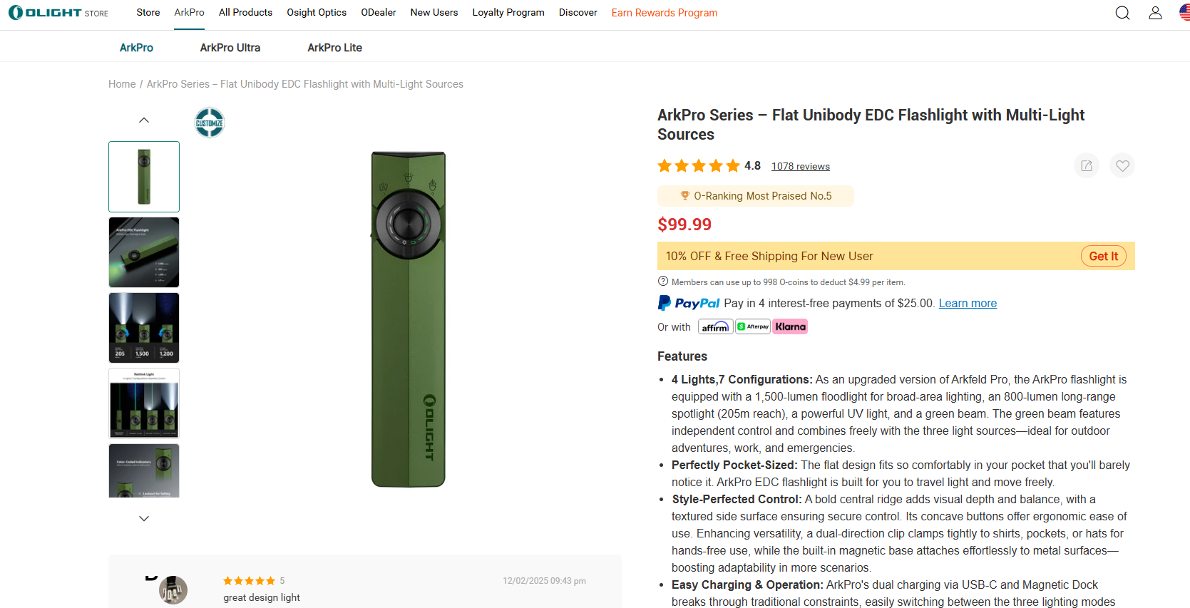 Olight ArkPro Series – Flat Unibody EDC Flashlight with Multi-Light Sources Green