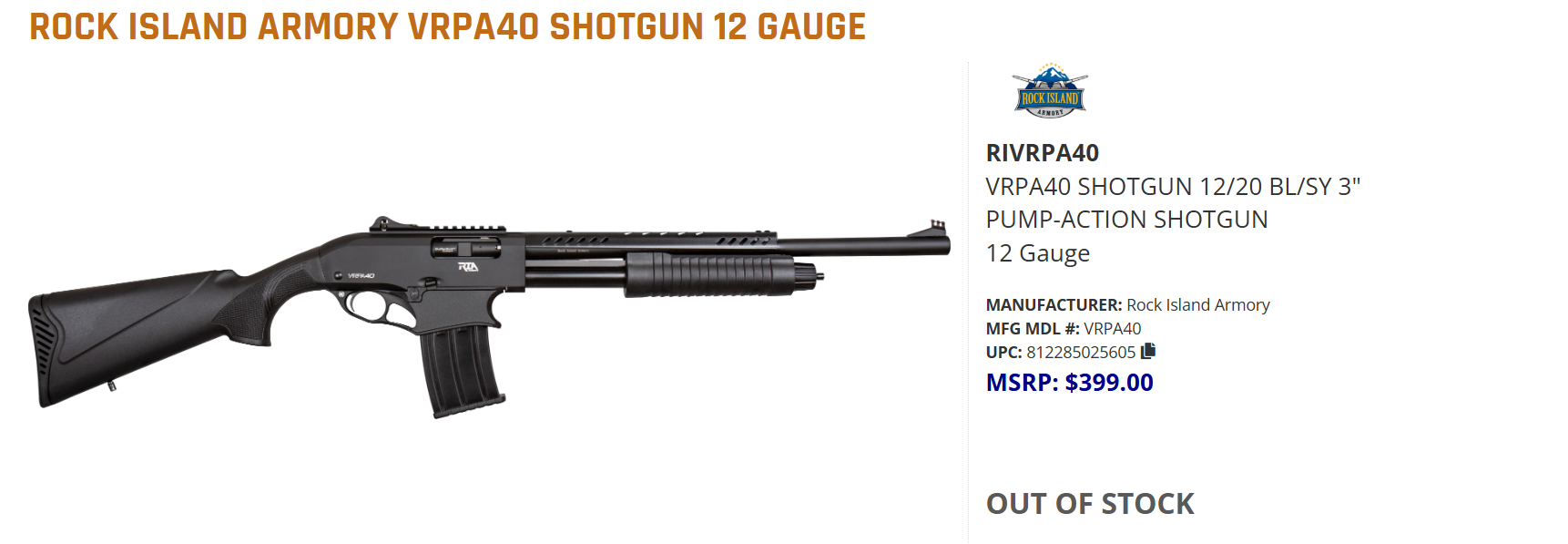 RIA VRPA40 SHOTGUN 12/20 BL/SY 3″ PUMP-ACTION SHOTGUN 12 Gauge 5605